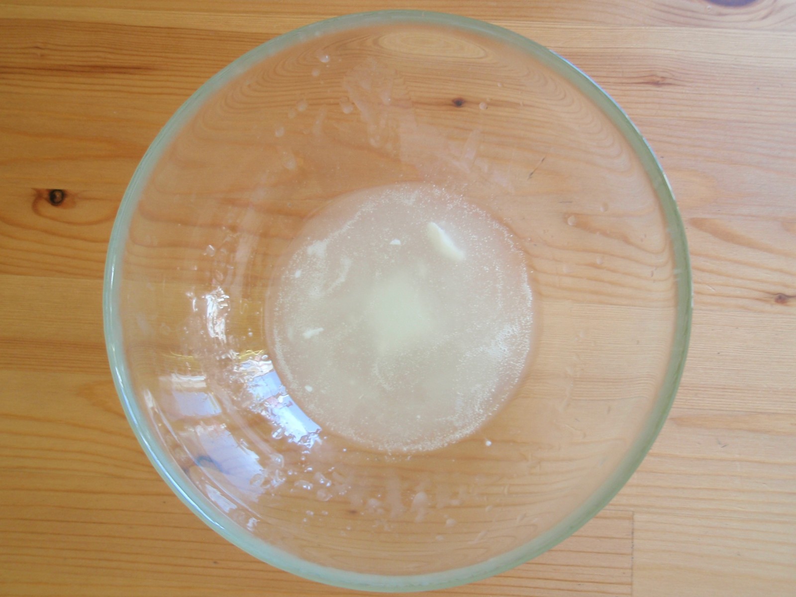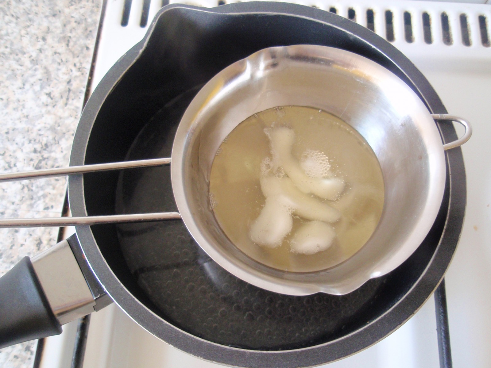 Karitejevo maslo je na sobni temperaturi v trdnem stanju, zato ga raztopimo v parni kopeli. Pazimo, da masla ne segrejemo preveč.