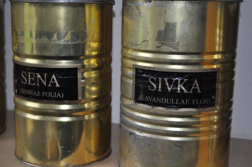 V upanju, da ju še malo zamotim, se s krhlji odpravim k blagajni v sosednjem prostoru. Skozi steklo zagledam svetleče zlate posodice, ki so videti kot ogromne konzerve. Ah, čudovito! Gospa prodajalka pove, da so Američani med 2. svetovno vojno v teh konzervah s padalom pošiljali sir. Domačini so konzerve nosili Ašiču, in ta je v njih shranjeval zelišča.