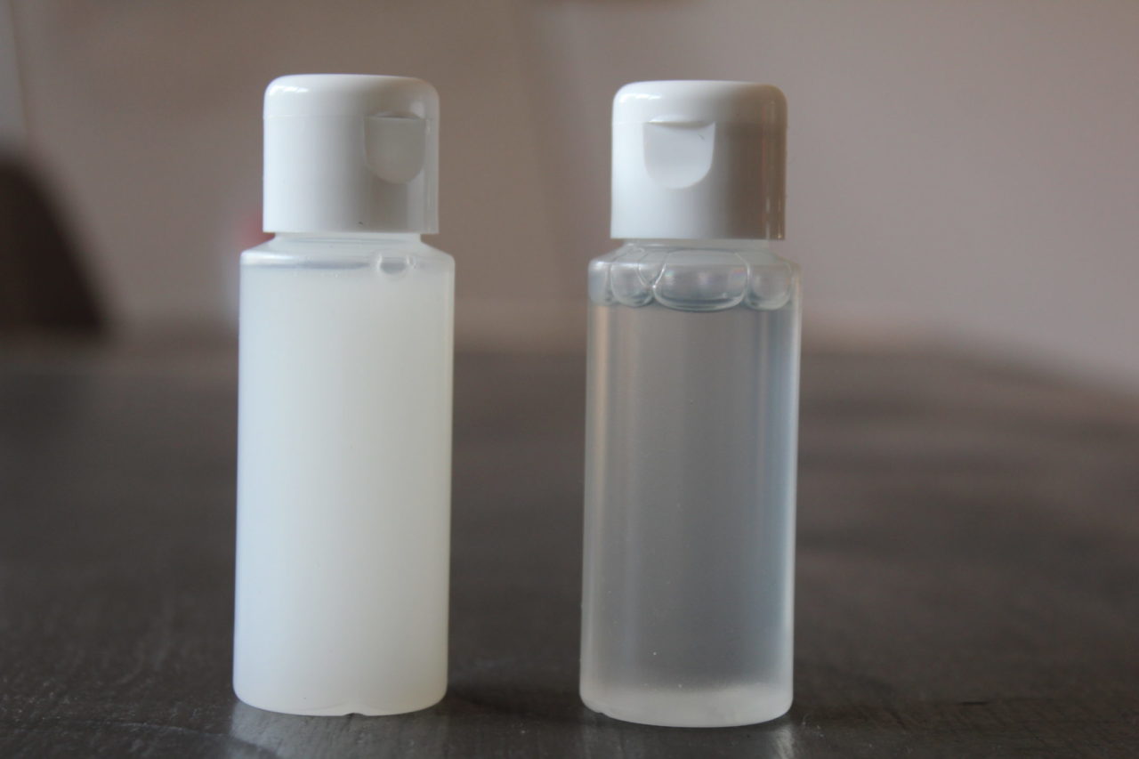- Če je tekočina videti prozorna in na vrhu ni kapljic eteričnih olj, lahko v naslednjem poskusu uporabimo manj solubilizatorja (na primer v razmerju 1:3). Pravilo je, da uporabimo toliko solubilizatorja, kolikor ga je nujno potrebnega (ne več in ne manj).
