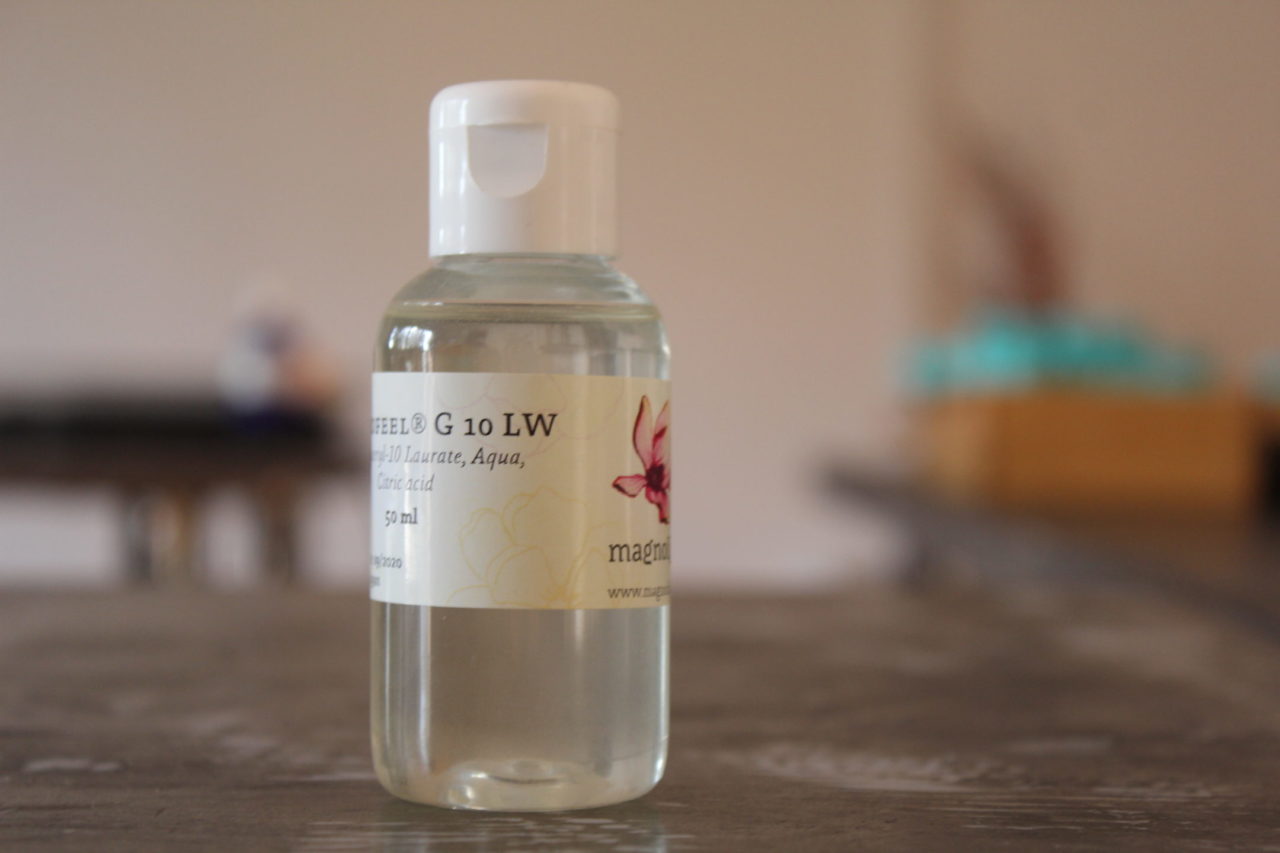 Dermofeel G 10 LW vsebuje Polyglyceryl-10 Laurate, snov, ki jo pridobimo iz dekaglicerola (dekamer glicerola) in lavrinske kisline (pridobljena s hidrolizo kokosovega olja). Polyglyceryl-10 Laurate je v tem izdelku redčen z vodo. Razmerje med eteričnim oljem in solubilizatorjem Dermofeel G 10 LW je po mojih izkušnjah nekje med 1:4 in 1:8.